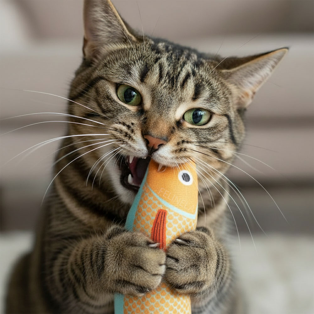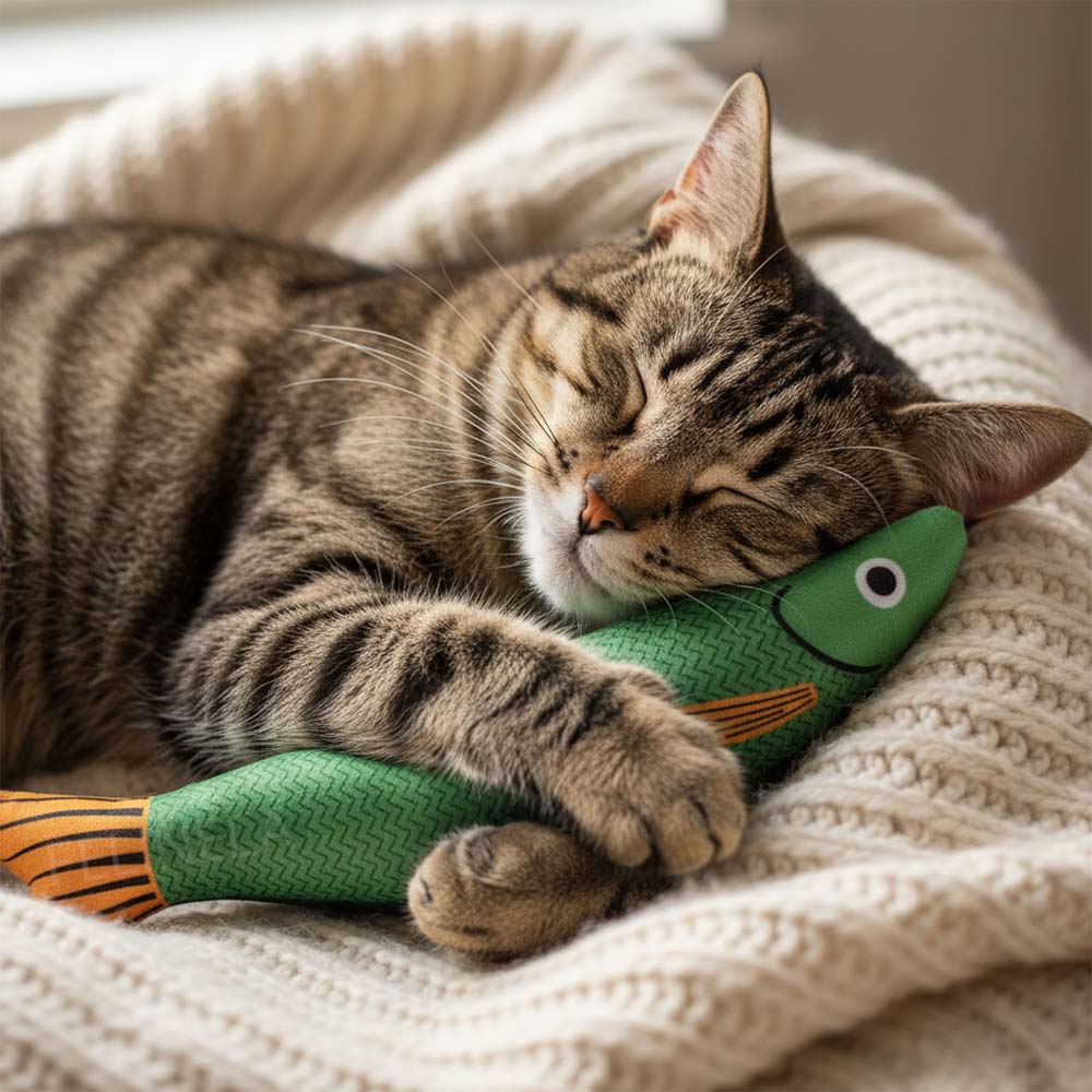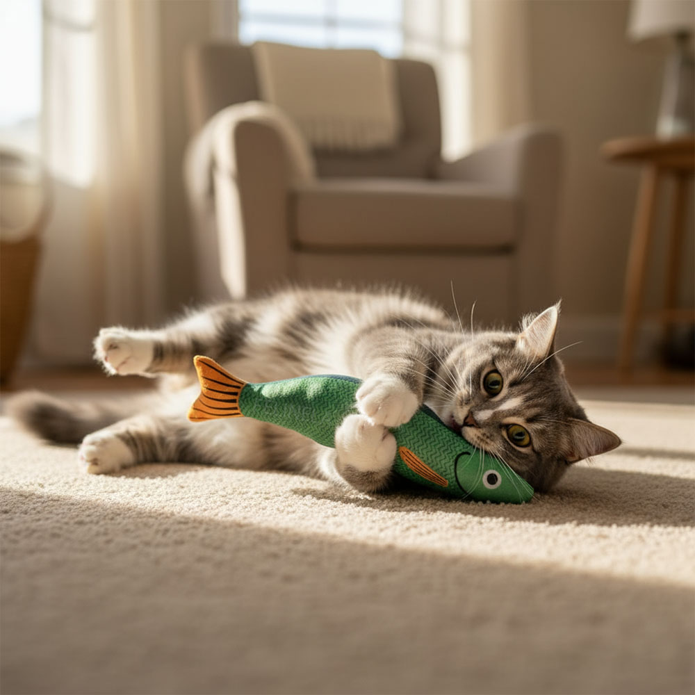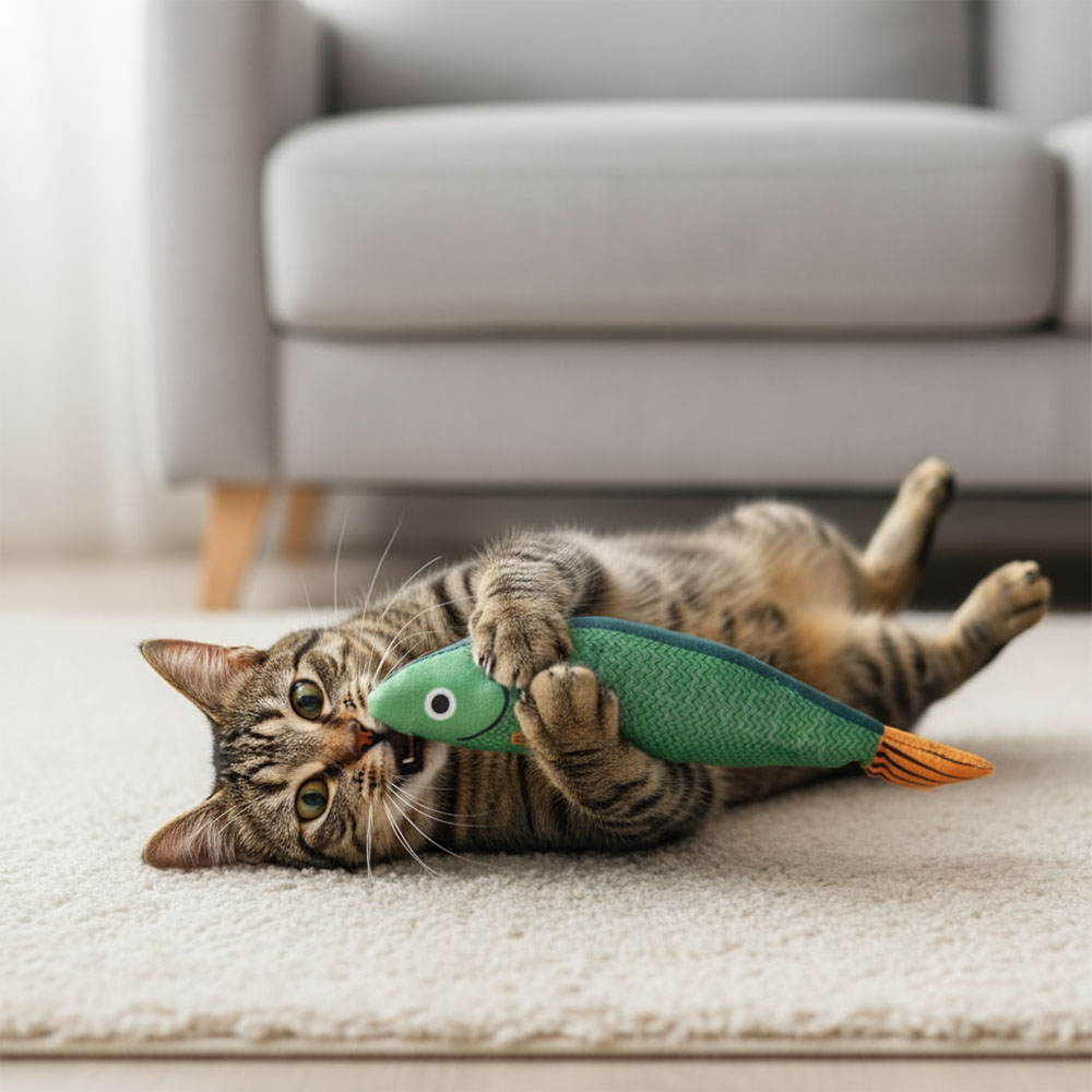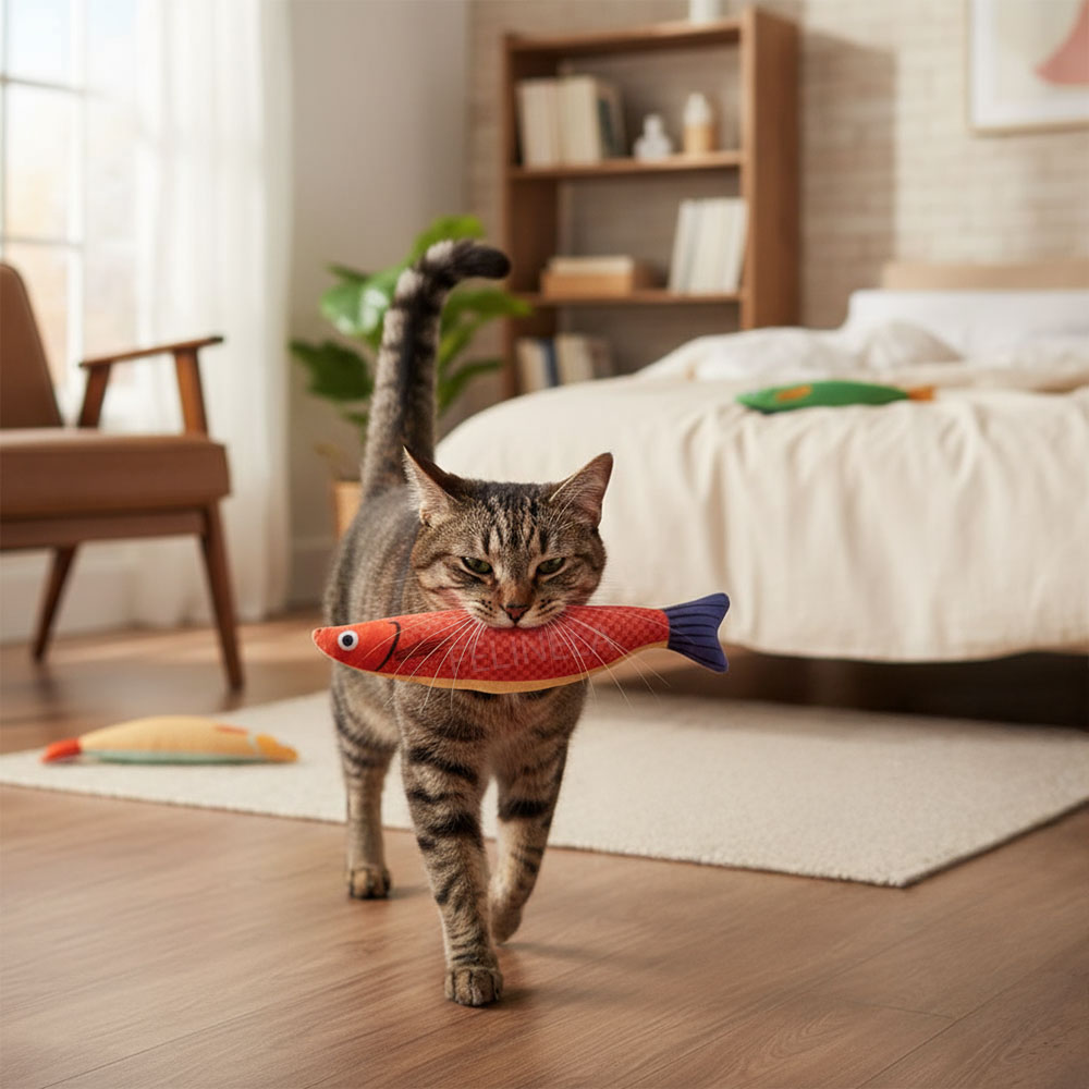 Mnoho kočičích hraček nevypadá dobře, když zůstanou ležet po bytě. Tato rybka je výjimkou – barevné provedení je estetické a působí spíš jako drobný doplněk než nepořádek. Navíc je měkká a lehká, takže ji kočka může nosit po celém bytě a schovat do oblíbených koutů. Pokud ji najdete v botě, na posteli nebo pod stolem, pravděpodobně si ji opravdu oblíbila.